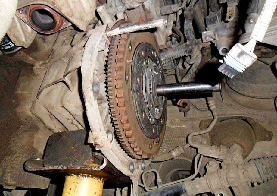 - Первым делом следует снять коробку передач (если этого не сделать вы не сможете подобраться к маховику и самому сцеплению).