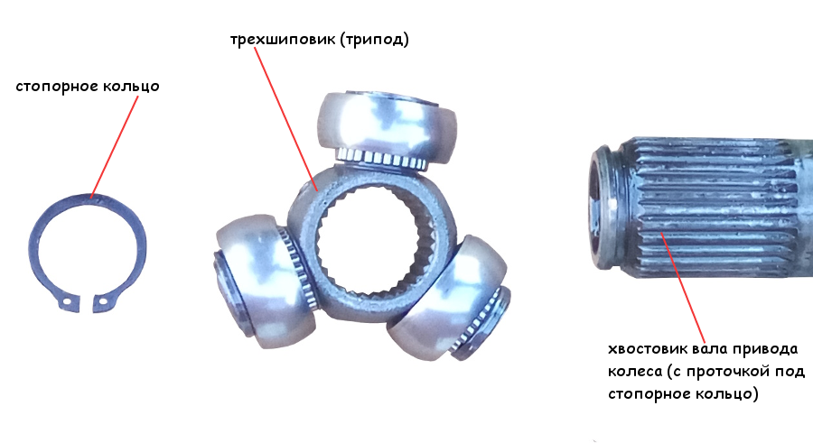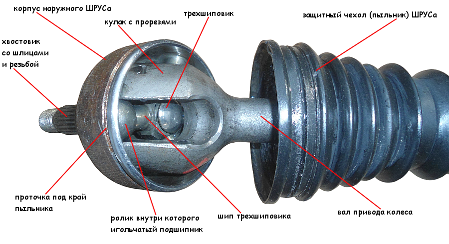 Наружный ШРУС каждого привода состоит из кулака, выполненного заодно с валом привода и корпуса с жестко закрепленным внутри него трехшиповиком с роликовыми подшипниками. На корпусе имеется шлицевой наконечник (хвостовик), который вставляется в ступицу колеса и крепится ступичной гайкой.