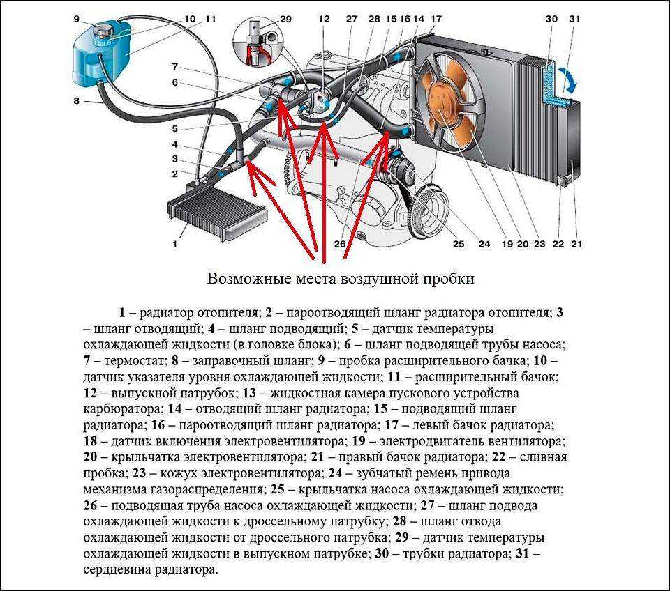 Наличие воздушной пробки в системе может указать на изношенные резиновые элементы, на которых в процессе эксплуатации появляются мелкие трещины. Он проникает мелкими пузырьками, скапливающимися на изгибах и в узких зонах контура охлаждения.