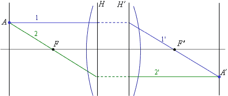 | Для того чтобы найти изображение точки , необходимо построить хотя бы два вспомогательных луча, на пересечении которых и будет находиться точка . Вспомогательный луч можно провести через точку параллельно оптической оси, тогда в пространстве изображений луч пройдет через задний фокус оптической системы. Вспомогательный луч можно провести через точку и передний фокус оптической системы, тогда в пространстве изображений луч пойдет параллельно оптической оси. На пересечении лучей и будет находиться изображение точки . |