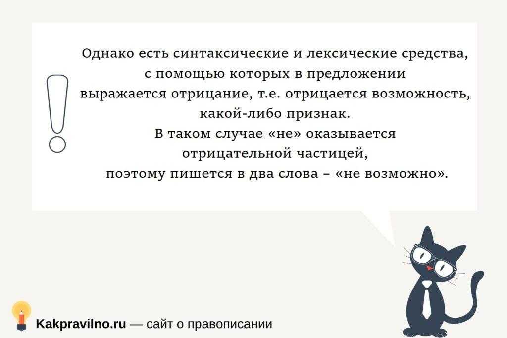 Итак, при наличии одного из названных трех условий «не» от слова «возможно» пишется отдельно.