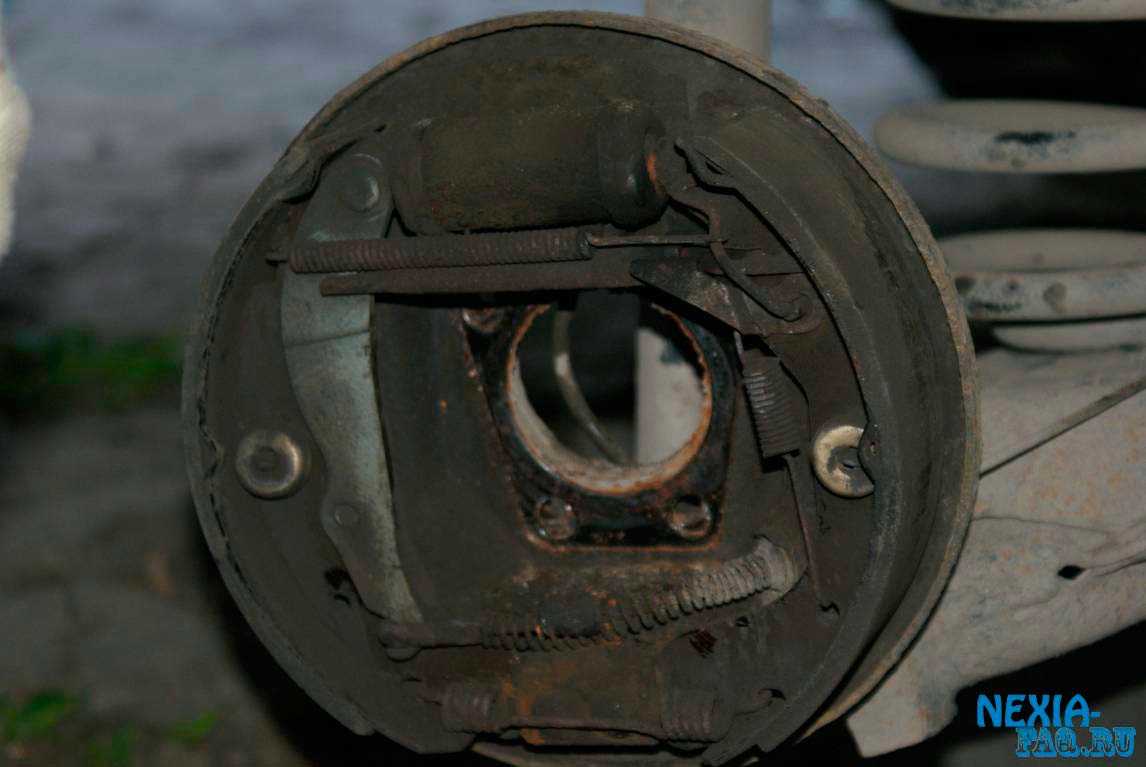 Следующим этапом подготовительного процесса станет снятие колес и тормозных барабанов (на автомобилях с тормозами дискового типа – суппорт и диски). Обеспечиваем неподвижность транспортного средства путем включения передачи, стояночного тормоза и установки противооткатных устройств.