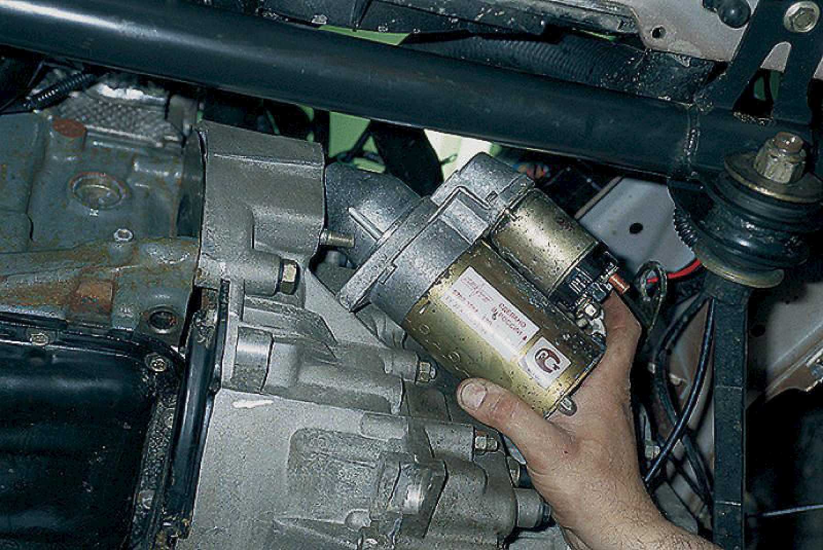 - Откручивается стартер. Он держится всего на двух болтах, к ним подбирается ключ, и стартер снимается.