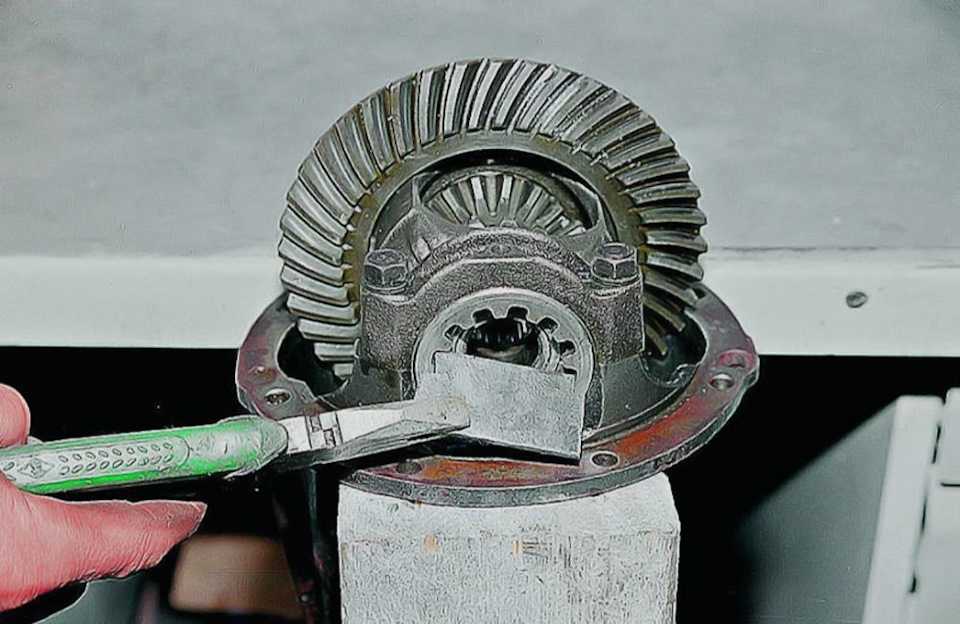 Зазор проверяют щупом через окна чашки диференциала. Разница в зазорах при измерении во всех окнах не должна превышать 0,1 мм.