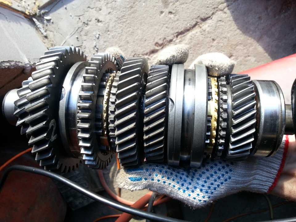 Аккуратно вынимаем шестерни и муфту синхронизаторов вторичного вала и запоминаем расположение деталей на валу