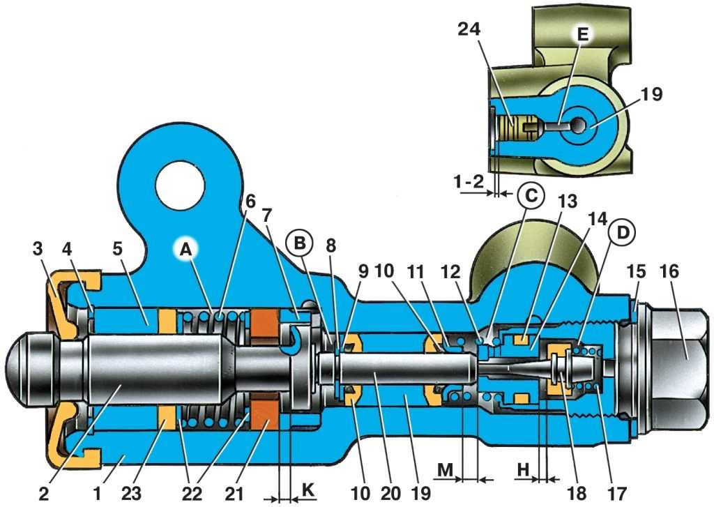 При нажатии на педаль тормоза поршень регулятора давления должен выдвинуться из корпуса регулятора на 1,6-2,4 мм, сжимая пружину