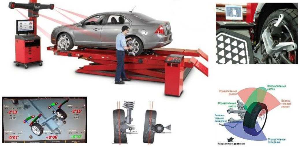 Для обеспечения устойчивости и управляемости автомобиля передние колеса автомобиля установлены под определенными углами относительно элементов кузова и подвески. Регулировке подлежат три параметра: схождение, угол развала колеса и угол продольного наклона оси поворота.