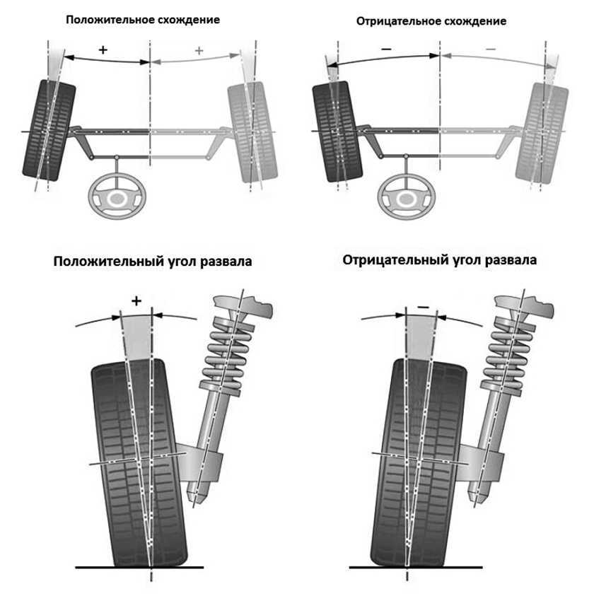 Второй важный параметр в настройке ходовой – схождение. Это угол установки колёс относительно оси автомобиля, измеренный в горизонтальной плоскости. От него зависит прямолинейность движения и сцепление протектора при вхождении машины в поворот. Существует 2 варианта установки схождения: