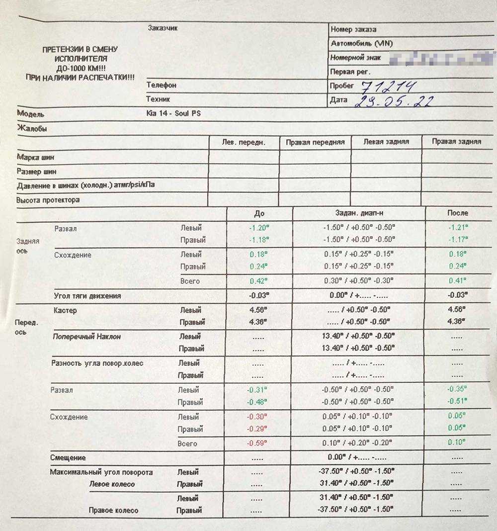 Похожий лист должны выдать, когда все настроят. В нем параметры, с которыми машина заехала на стенд, и результат работы. В этом случае развал-схождение делали на Киа Соул. Сзади балка, поэтому показания до и после примерно одинаковые