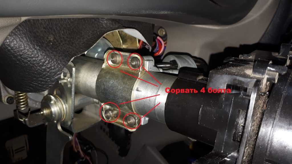 - На металлическом кожухе рулевой колонки вы увидите крепление замка, состоящее из двух хомутов. Они стянуты 4 болтами с оторванными головками (видны с левой стороны). Наставляя зубило на полукруглые шляпки, ударами молотка поочерёдно ослабьте затяжку этих болтов.