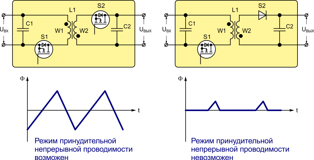 Режим принудительной непрерывной проводимости возможен только в случаях, когда ключи S1 и S2 обеспечивают протекание тока в обоих направлениях, ведь при переменном магнитном потоке, в соответствии с законом полного тока, ток в обмотках также будет переменным. Для рассматриваемого обратноходового преобразователя, в котором ток всегда протекает только по одной обмотке, связь токов I1 и I2 обмоток W1 и W2 с магнитным потоком F будет определяться формулами: