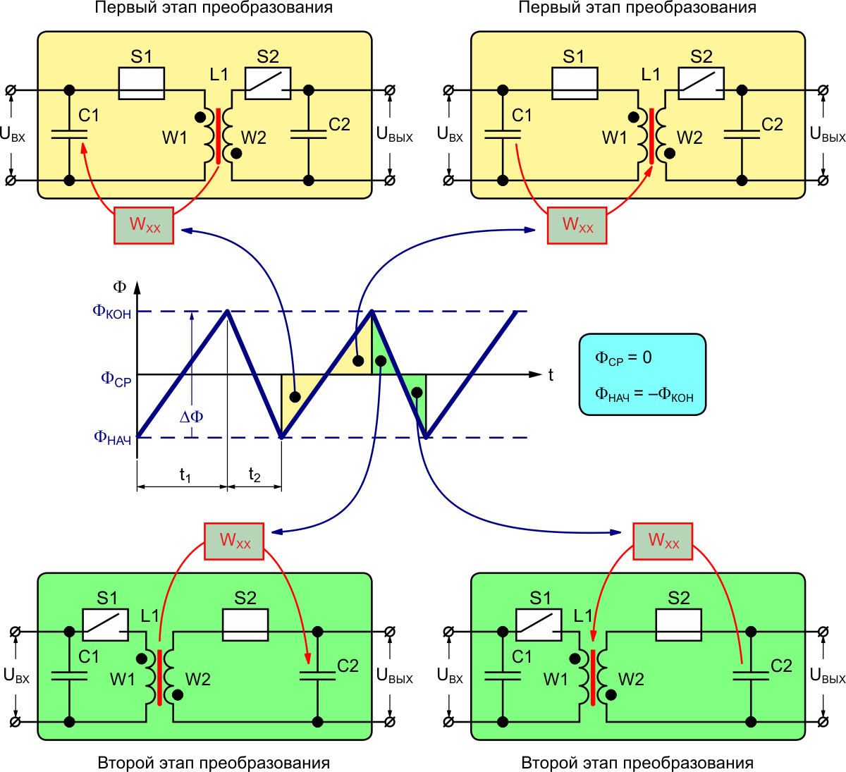 Дальнейшее уменьшение тока нагрузки приведет к еще большему смещению магнитного потока дросселя в отрицательную область. При полном отключении нагрузки преобразователь перейдет в режим холостого хода, особенностью которого является соблюдение равенства ФНАЧ = –ФКОН. В этом режиме между конденсаторами С1 и С2 происходит обмен энергией величиной WХХ (Рисунок 7):
