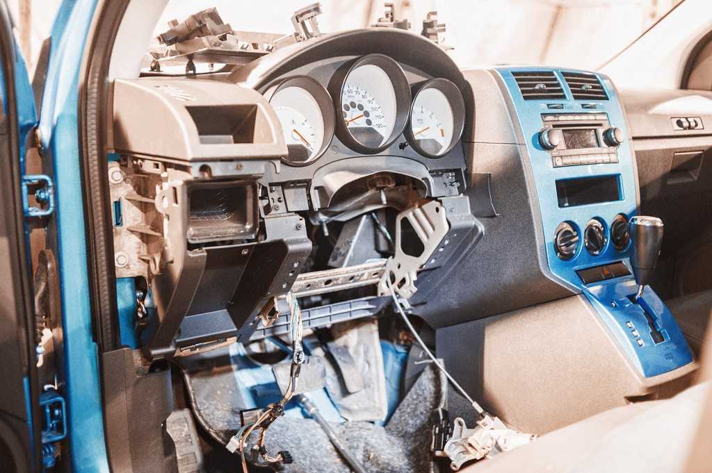 Перед начало работ первым делом откручиваем и изолируем минусовую клемму с аккумулятора. Отгибаем обшивку пола чтобы добраться до сочленения колонки и рейки, ставим колёса прямо и слегка выворачиваем вправо, чтобы добраться до соединительного болта. Выкручиваем его и снова ставим колёса ровно. Снимаем водительскую подушку безопасности, отсоединяем коннектор от клокспринга, откручиваем болт, удерживающий рулевое колесо, снимаем переключатель круиз-контроля (если есть) и аккуратно снимаем руль. Поднимаем рулевую колонку в верхнее положение, удаляем пластиковые кожухи сверху и снизу от рулевой колонки, отсоединяем коннекторы и снимаем клокспринг вместе с правым и левым подрулевыми переключателями. Демонтируем замок зажигания, блок беспроводной электроники, контактную группу, для машин с вариатором – трос блокировки селектора.