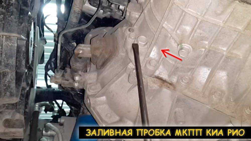 - Откручиваем пробку контроля уровня и начинаем заливать в заливную пробку новое масло. Льем до тих пор пока из контроля не польется. Вмещается в МКПП Рио около 2-х литров.