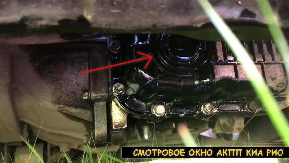 Если смотреть спереди автомобиля, то не далеко от левой фары под днищем расположенный поддончик, который держится с помощью двух болтов. Откручиваем его, это защита. Далее нам открывается автоматическая коробка переключения передач. На фото ниже изображено смотровое окно. При работающем двигателе на нейтральной передаче открываем это окошко и смотрим. Если трансмиссионное масло струйкой начало вытекать, значит это норма и доливка не требуется.