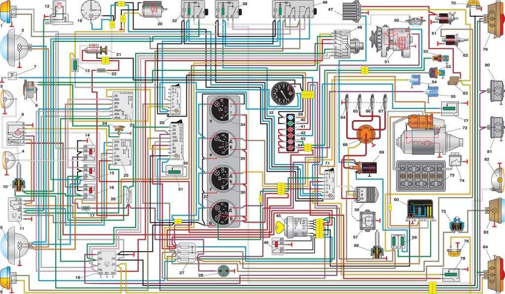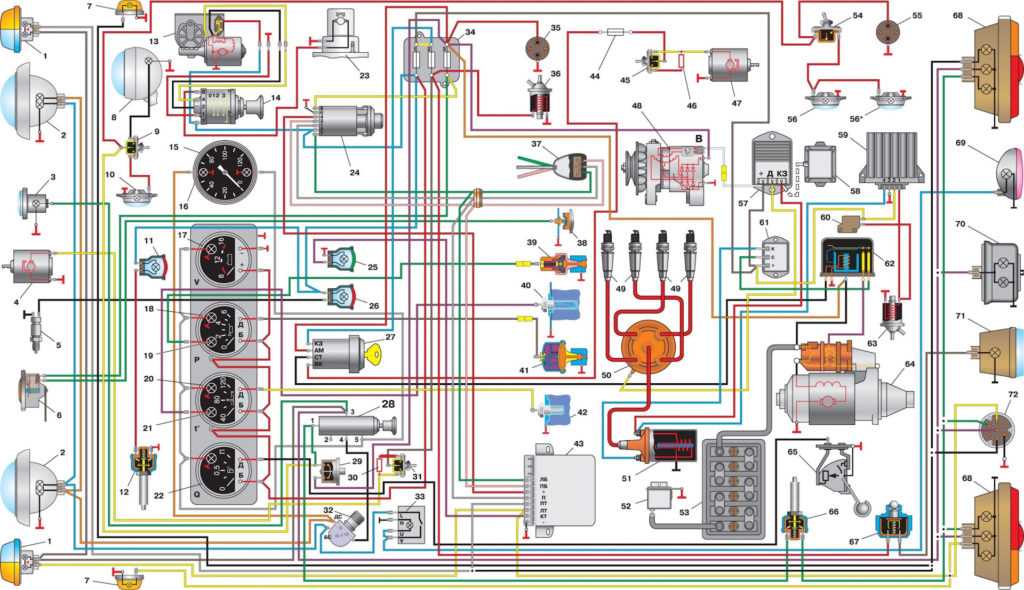 1-передний фонарь; 2-фара; 3-повторитель указателей поворота; 4-электродвигатель смывателя; 5-электродвигатель стеклоочистителя; 6-переключатель стеклоочистителя и смывателя; 7-звуковой сигнал; 8-выключатель плафона кабины; 9-плафон кабины; 10-выключатель звукового сигнала; 11-спидометр; 12-сигнальная лампа включения дальнего света фар; 13-вольтметр; 14-указатель давления масла; 15-сигнальная лампа аварийного давления масла; 16-указатель температуры охлаждающей жидкости в блоке цилиндров; 17-сигнальная лампа аварийного перегрева охлаждающей жидкости в радиаторе; 18-указатель уровня топлива в баке; 19-тепловой предохранитель; 20-ножной переключатель света; 21-выключатель аварийной сигнализации; 22-штепсельная розетка; 23-блок плавких предохранителей; 24-сигнальная лампа включения стояночного тормоза; 25-сигнальная лампа аварийного состояния гидропривода тормозов; 26-сигнальная лампа указателей поворота; 27-переключатель указателей поворота; 28-прерыватель указателей поворота; 29-выключатель зажигания; 30-выключатель сигнальной лампы включения стояночного тормоза; 31-выключатель сигнальной лампы аварийного состояния гидропривода тормозов; 32-датчик сигнальной лампы аварийного перегрева охлаждающей жидкости в радиаторе; 33-датчик сигнальной лампы аварийного давления масла; 34-датчик указателя давления масла; 35-датчик указателя температуры охлаждающей жидкости в блоке цилиндров; 36-центральный переключатель света; 37-генератор; 38-регулятор напряжения; 39-выключатель фонаря заднего хода; 40-выключатель электродвигателя вентилятора в кабине; 41-выключатель электродвигателя вентилятора отопителя в кабине; 42-выключатель сигнала торможения; 43-свеча зажигания; 44-датчик-распределитель; 45-добавочное сопротивление; 46-катушка зажигания; 47-стартер; 48-дополнительное реле стартера; 49-аккумуляторная батарея; 50-выключатель «массы»; 51-электродвигатель вентилятора в кабине; 52-электродвигатель вентилятора отопителя в кабине; 53-плафоны грузового отсека; 54-датчик указателя уровня топлива в баке; 55-прикуриватель; 56-аварийный вибратор; 57-транзисторный коммутатор; 58-электронный блок управления карбюратором; 59-электромагнитный клапан; 60-микровыключатель; 61-выключатель плафонов; 62-выключатель противотуманного фонаря с встроенной сигнальной лампой включения; 63-задний фонарь; 64-фонарь освещения номерного знака; 65-фонарь заднего хода; 66-противотуманный фонарь; 67-клапан разбалансировки поплавковой камеры карбюратора