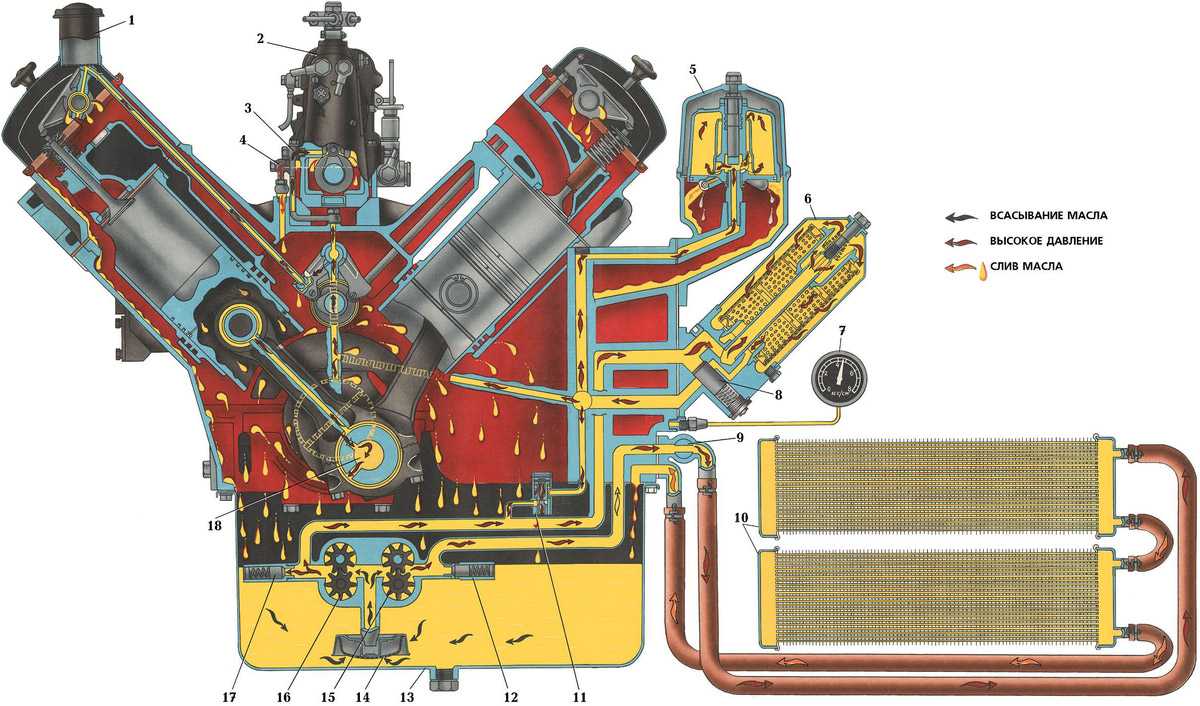 Решает эти проблемы система смазки двигателя. Главное, что выполняет система смазки — заменяет «сухое» трение на «мокрое», в результате трение между трущимися деталями снижается на порядок, и двигатель может нормально работать.