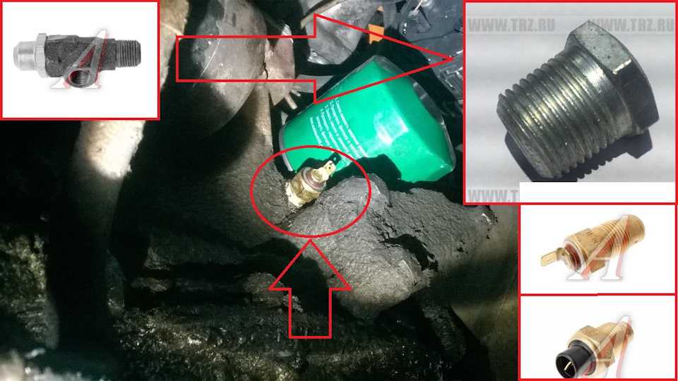 Что делаем:1.Демонтируем защиту.2.Сливаем масло.3.Снимаем фильтр.4.Выкручиваем Клапан ГАЗ-24 радиатора масляного редукционный (ОАО ГАЗ) 631013095, справа.5.Заворачиваем Пробку КГ 3/8″ (КГ 3/8.10КП.016).У меня таковой под рукой не оказалось, в дело пошел датчик ТМ-106111 из ближайшего магазина, там тоже 38 коническая.