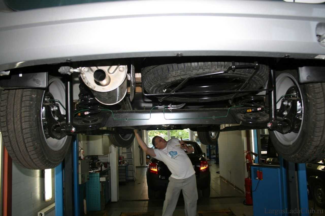 - Машину устанавливаем на смотровую яму, лучше подъемный механизм, предварительно выжав ручник стояночного тормоза;