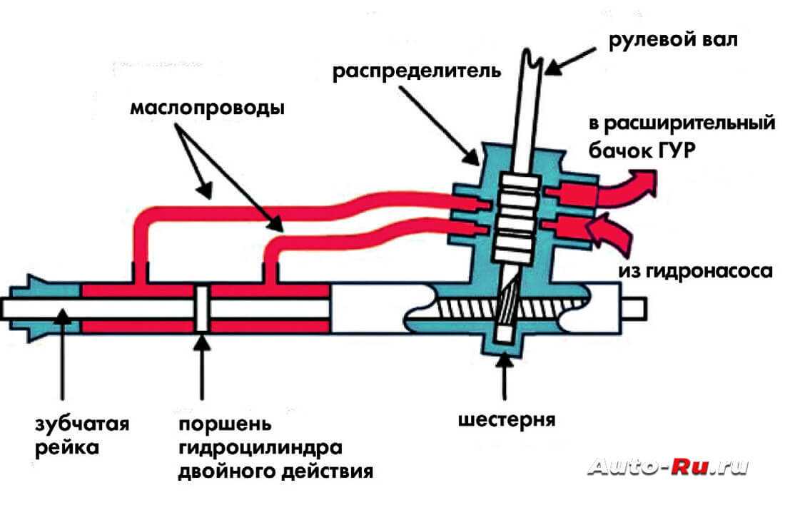 При повороте руля приоткрываются клапаны с определённой стороны, и масло устремляется по открытым магистралям, давя на поршень в одну или другую сторону, а он уже двигает рейку.