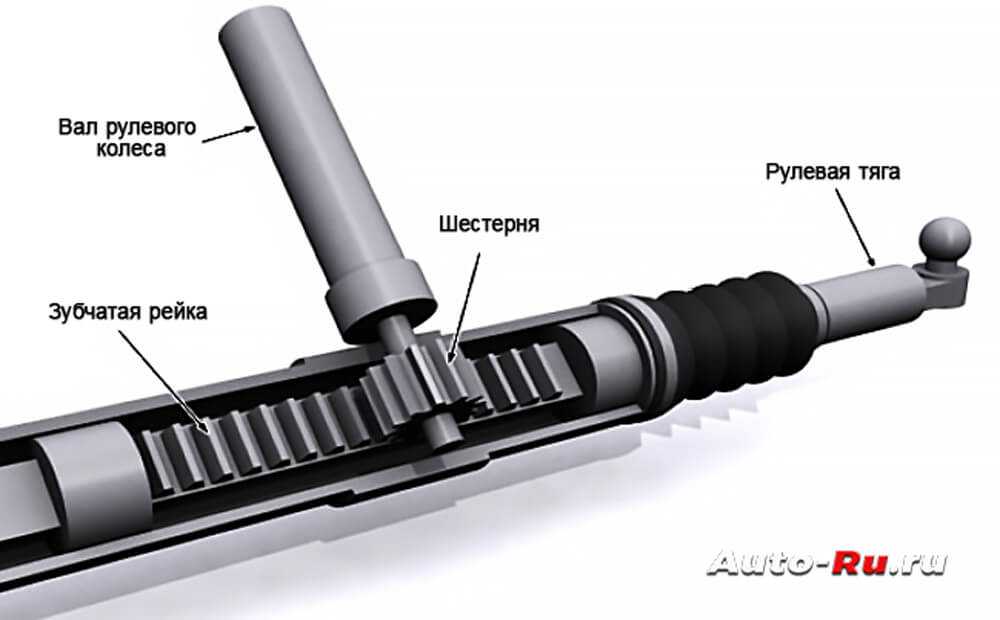 Итак, рулевая рейка выполняет важную задачу – преобразовывает вращение «баранки» в повороты колёс в горизонтальной плоскости. Рассмотрим процесс детальнее.