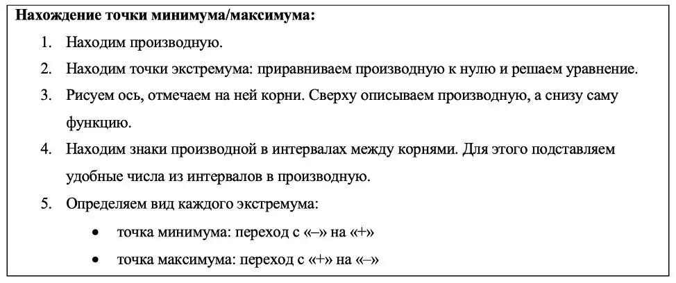 Теперь, когда мы разобрались, как не запутаться и понять, что необходимо найти в задаче, приступим к разбору самих заданий и алгоритмов к ним. Начнём с поиска точек экстремума. Чтобы провести анализ функции, необходимо определить основные этапы. У функции есть точки экстремума, в них производная равна нулю. Единственный способ, определить, является ли данная точка точкой максимума или минимума – это определить знаки производной до и после неё, если знак производной меняется с «–» на «+», то это будет точка минимума, а если с «+» на «–», то точка максимума. Таким образом общий порядок действий будет следующим: