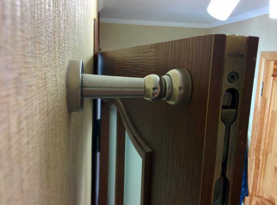 Дверной ограничитель можно дополнить вакуумным фиксатором или магнитом. В особенности данные приспособления будут полезны, если дверь ставили без использования уровня. В этом случае полотно может само распахнуться или захлопнуться.