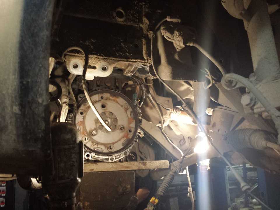 Поверните коленчатый вал по часовой стрелке так, чтобы получить доступ к трем гайкам, соединяющим ведущий диск с гидротрансформатором. Снимите верхние шпильки крепления картера коробки-автомат Рено Меган 2 к блоку двигателя.