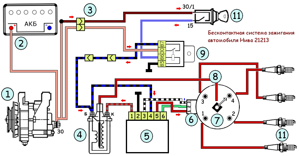 Схема бесконтактной системы зажигания автомобиля Нива 21213 по ней можно «вычислить» неисправный участок электрической цепи
