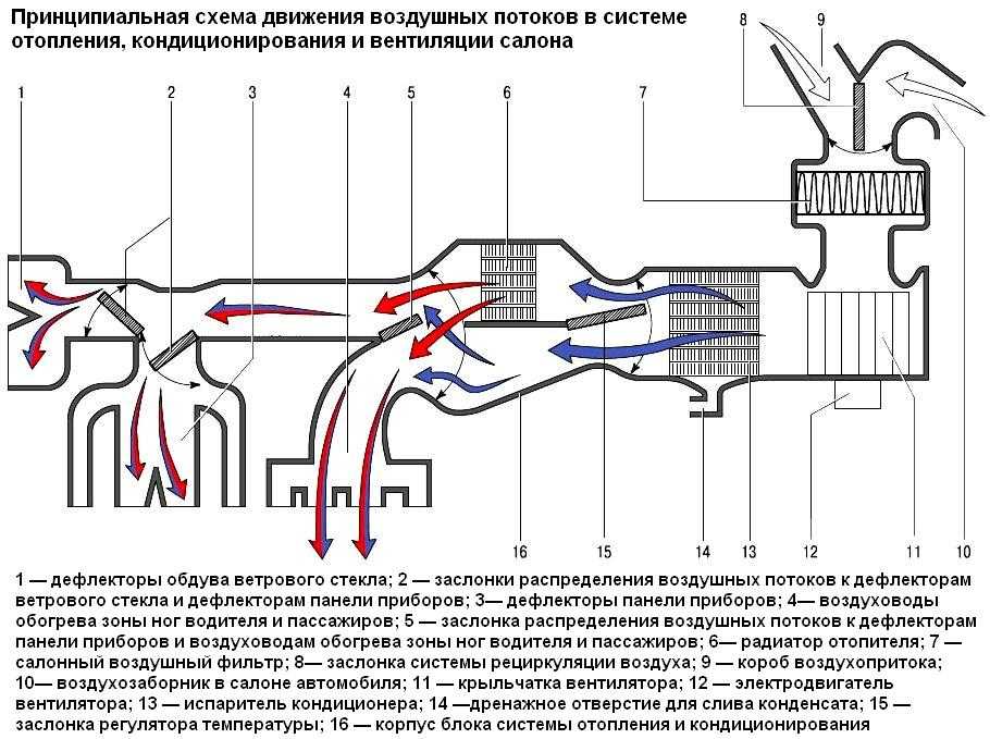 — теплообменник (радиатор) 6 (рис. 1) отопителя, предназначенный для нагревания поступающего в салон воздуха теплом охлаждающей двигатель жидкости;