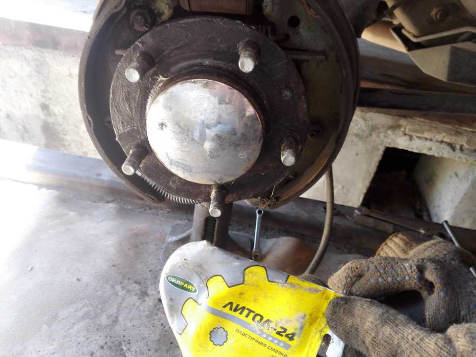 Закручивать болтики на место не очень удобно — они мелкие, а рядом мешает амортизатор)Для облегчения будущего снятия барабана снова смазал литолом посадочную плоскость ступицы и нижние части шпилек (резьбу шпилек надеюсь смазывать никто не будет)))) Можно использовать графитовую смазку, но у меня её не было: