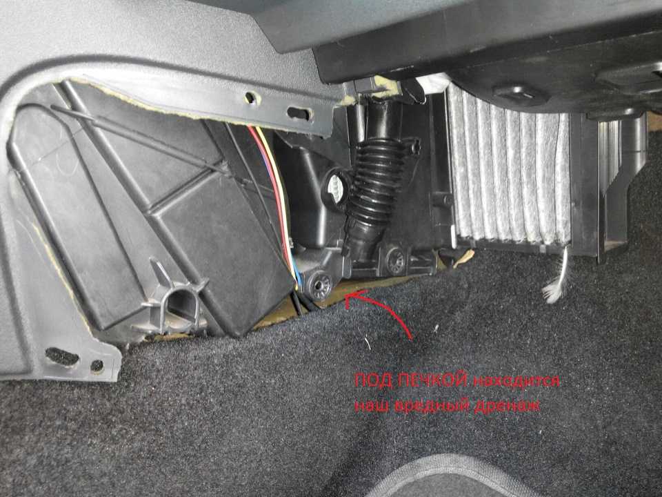 5. отгинаем коврик чтобы он нам не мешал.6.Далее смотрим под печку. дренаж находится куда показывает стрелка на рисунке ниже