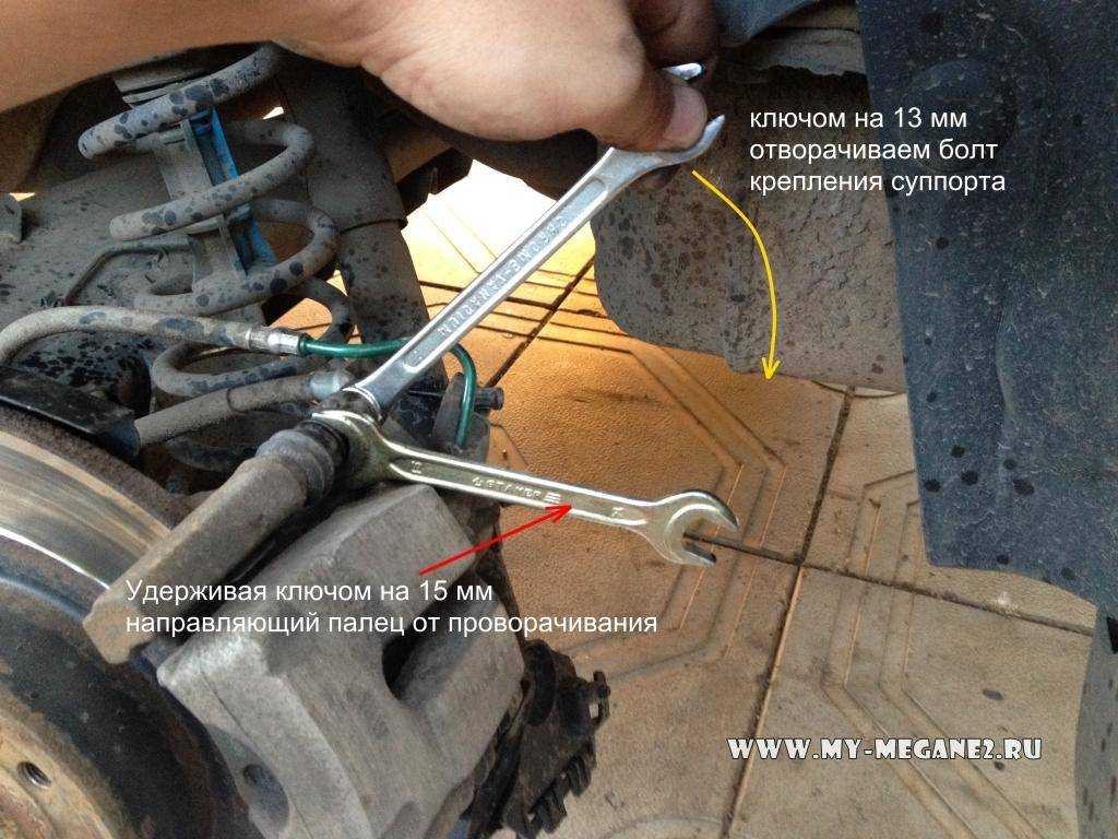 Важно знать, чтобы не крутился при работе направляющий палец, его следует держать ключом 15мм. Заранее заготовленным ключом 13мм раскручиваем верхние и нижние, то есть все, болтовые соединения тормозного суппорта