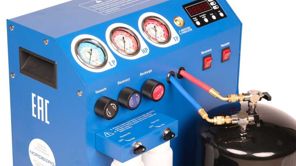 После диагностики магистралей и узлов на течь заправку автокондиционера выполняют специальным оборудованием.